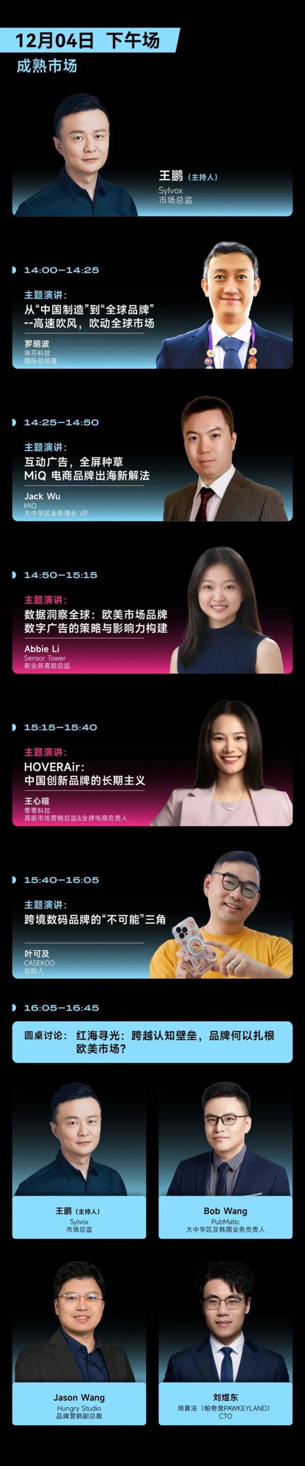 针对竞争激烈的欧美市场PubMatic大中华区及韩国业务负责人Bob WangHungry Studio品牌营销副总裁Jason Wang等嘉宾,将与主持人 Sylvox市场总监王鹏聚焦《红海寻光,跨越认知壁垒,品牌何以扎根欧美市场?》。