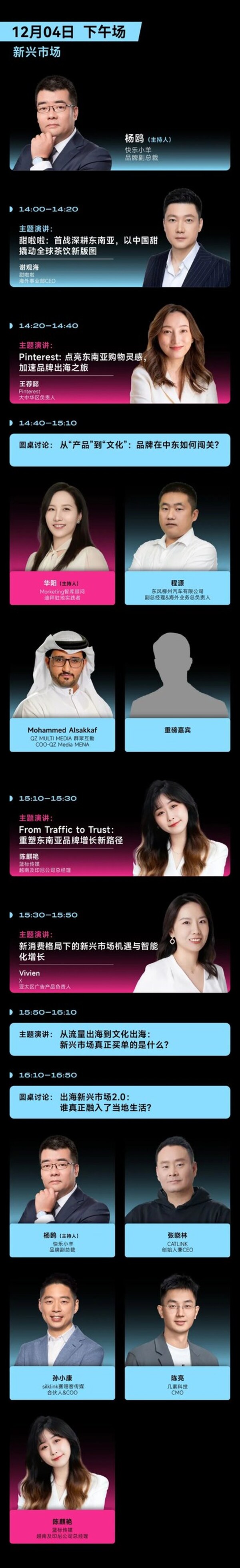 针对东南亚市场CATLINK创始人兼CEO张晓林、SILKLINK赛翎客传媒合伙人&COO孙小康、几素科技CMO陈亮 、蓝标传媒越南及印尼公司总经理陈麒艳,将与主持人快乐小羊品牌副总裁杨鸥,以《出海新兴市场 2.0,谁真正融入了当地生态?》为主题展开讨论。