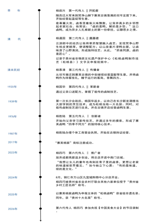 从江南商贾到武陵山民,从商船如织的古镇码头到信息高速的现代都市,杨氏一家六代人,用最朴素的方式,诠释了什么是“匠心精神”。他们没有想过要把生意做得多大,只想用一生,做好一只鸭子。正如当地人所说,如果你来到寨英古镇,品尝了米豆腐后若不尝一尝杨家卤鸭,那将是一生的遗憾。因为那一口下去,品尝到的不仅是一道美食,更是六代人的光阴、坚守和那份穿越百年的纯朴初心。