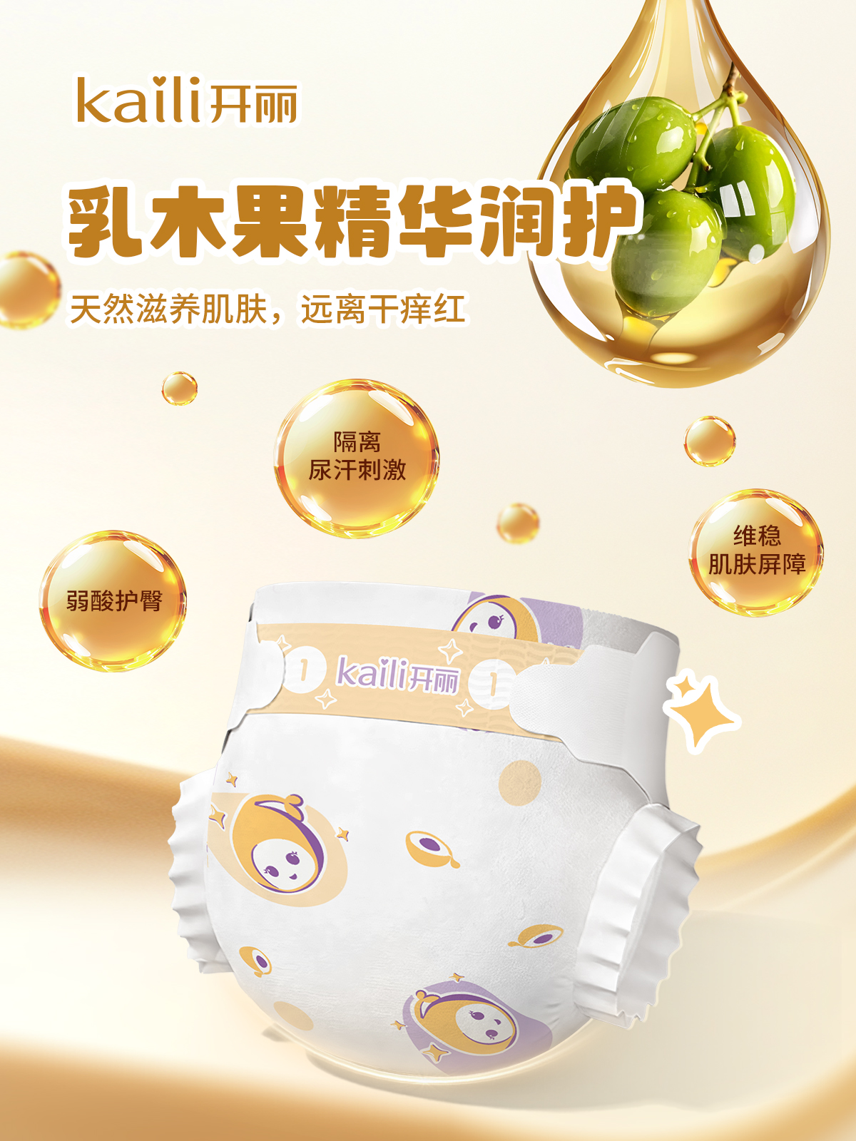 洞察新生代父母对“护肤级护理”的迫切需求,开丽创新将乳木果精华融入产品面层,被誉为“肌肤软黄金”的天然滋养成分,能在宝宝臀部形成温和保护膜,长效缓冲尿液与粪便刺激,温柔守护新生儿娇嫩肌。