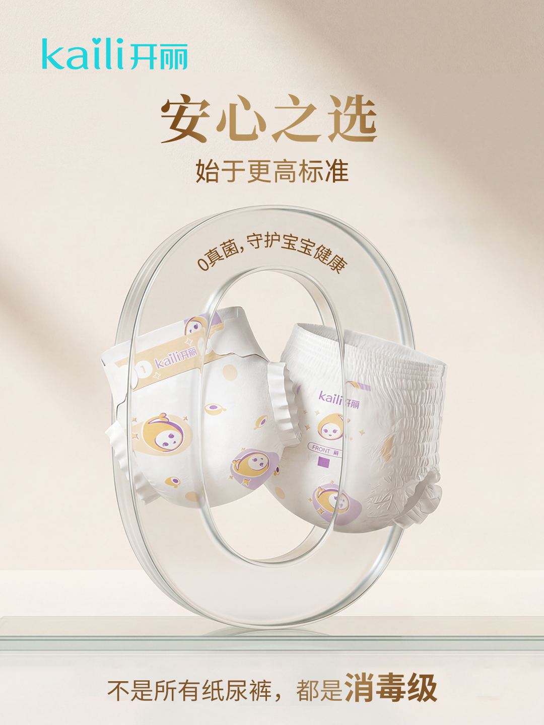 开丽纸尿裤/成长裤全线承袭品牌医用基因,采用环氧乙烷消毒,严格达到国标消毒级微生物要求,0真菌更卫生更安全,从源头降低红屁屁、过敏、刺激等风险,给宝宝从第一片开始的安心守护。