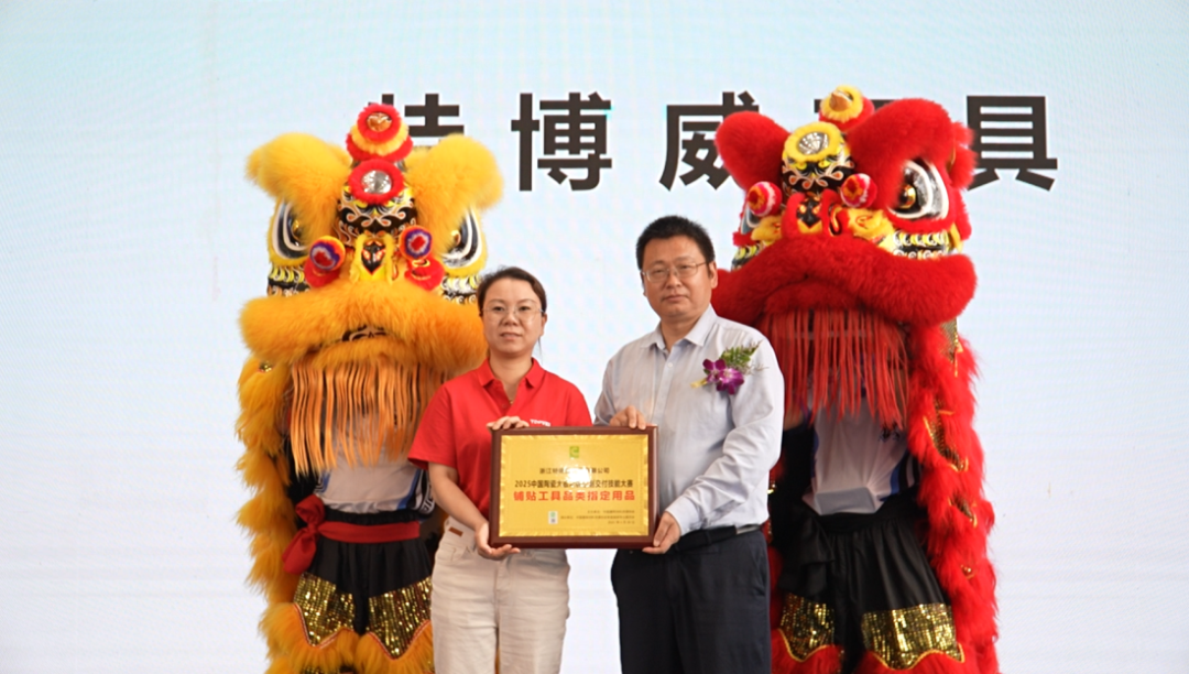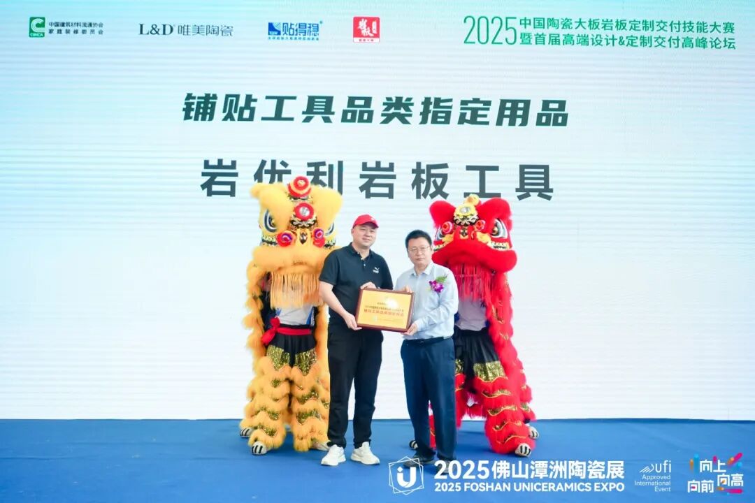 接下来,岩优利岩板工具和特博威工具获得了“铺贴工具品类指定用品”荣誉。这两个品牌的工具产品在本次大赛中为选手们提供了优质的施工支持,确保了岩板定制交付的精确和高效。特别是它们的创新设计和高标准的产品质量,极大地提高了施工效率和质量。