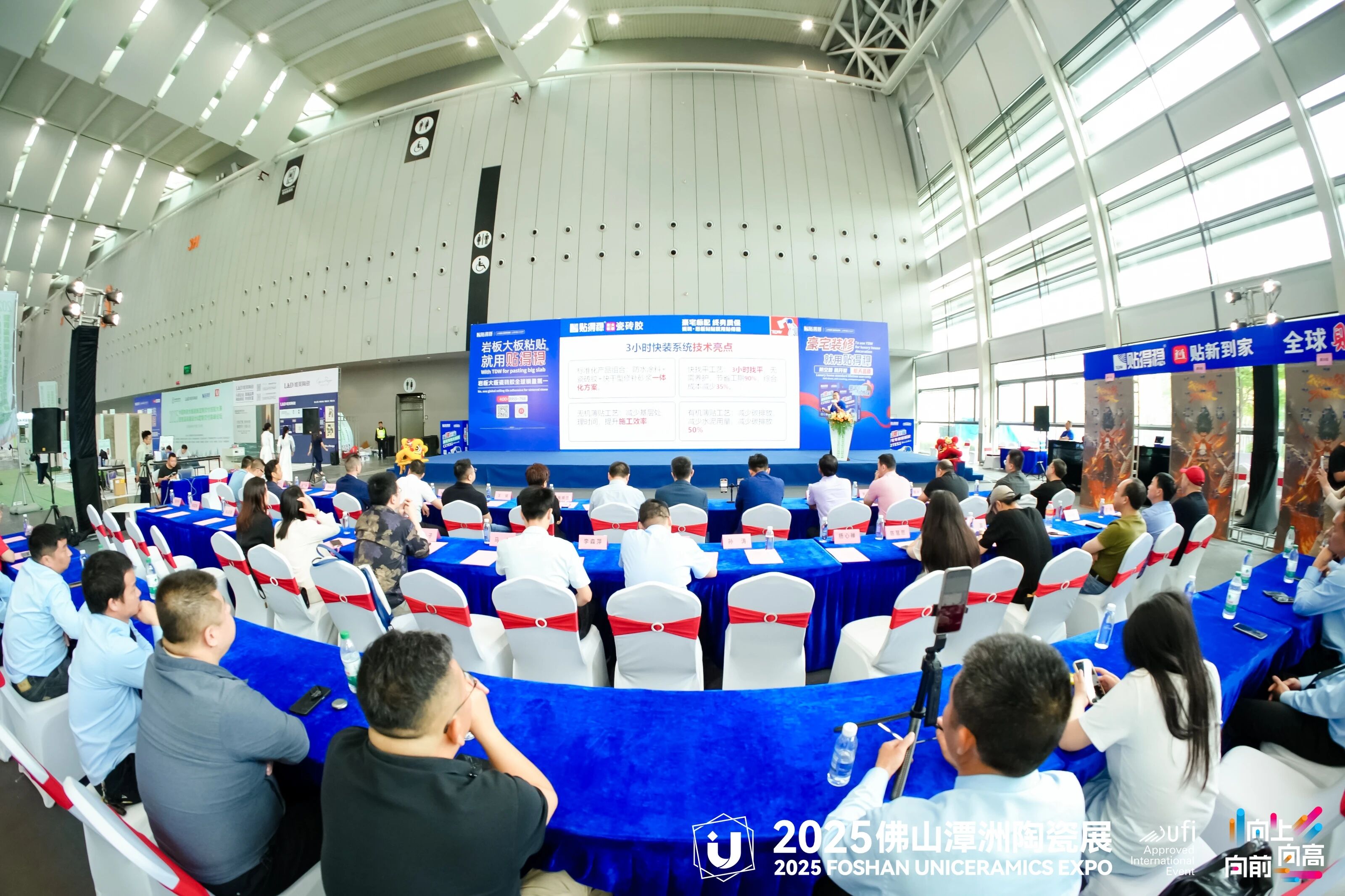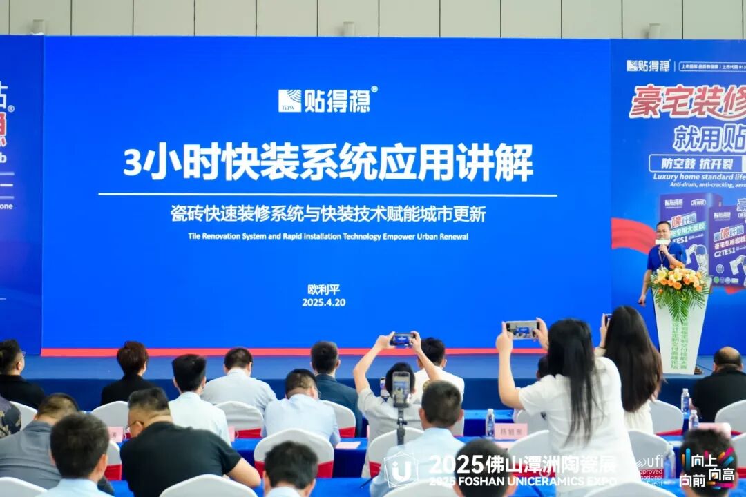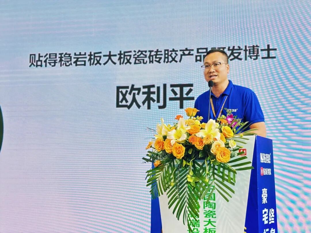 紧接着,贴得稳岩板大板瓷砖胶产品研发博士欧利平先生进行了“3小时快装系统应用讲解”的主题演讲。欧博士详细介绍了这一革命性技术,探讨了如何在施工中提升效率的同时保持高质量标准。这项技术的成功应用,不仅提升了施工效率,也推动了整个行业向标准化与高效化迈进。