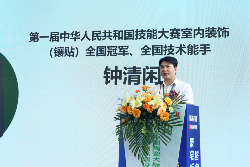 第一届中华人民共和国技能大赛室内装饰(镶贴)全国冠军钟清闲专家发表了致辞。钟专家在致辞中分享了自己的参赛经验,并强调了技术与工艺在岩板定制交付中的重要性:“岩板定制交付不仅仅是技术的较量,更是工艺与创新的结合。作为一名技能大赛冠军,我深知,精湛的技术和工艺的结合才能够保证岩板定制交付的质量和效果。”