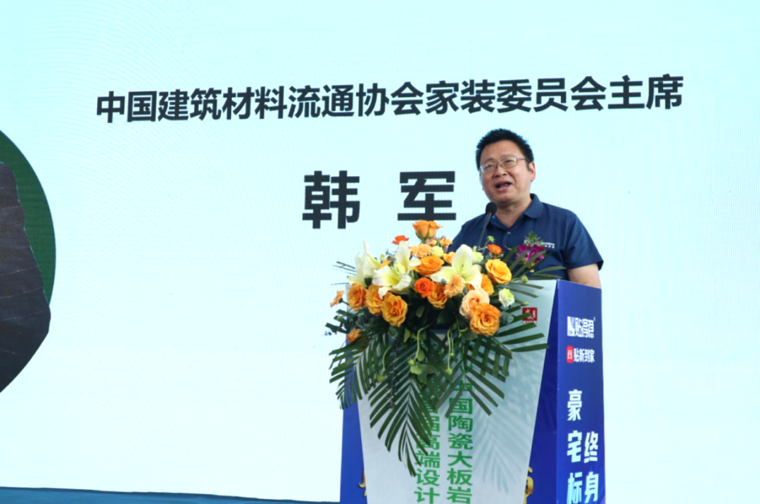 紧接着,活动进入领导致辞环节。首先,由中国建筑材料流通协会家装委员会主席韩军先生发表了精彩的开幕致辞。韩主席在讲话中深入分析了岩板定制交付行业在当今市场背景下面临的机遇与挑战。他强调,随着消费者对家装定制需求的不断升级,岩板定制交付将成为家装行业未来发展的重要方向。韩主席表示:“技术创新与精益求精的工艺提升是行业发展的核心动力,而本次大赛的举办为技术创新提供了展示的舞台,同时也为行业的持续进步搭建了桥梁。”
