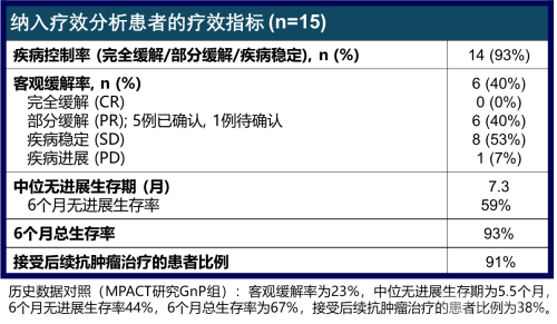 数据显示,在2 mg/kg spevatamig每周一次给药联合GnP一线治疗mPDAC的15例患者中(n=15),有6例患者达到部分缓解(其中5例已确认,1例待确认)、8例患者疾病稳定,疾病控制率为93%(对比关键临床研究中的48%),客观缓解率为40%。