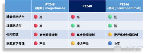 一方面,在抗CD47单克隆抗体的选择上,Phanes Therapeutics使用了三种具有不同生物学特征的抗CD47单克隆抗体,即与magrolimab类似的PT248、与lemzoparlimab类似的PT246和与众不同的PT240。